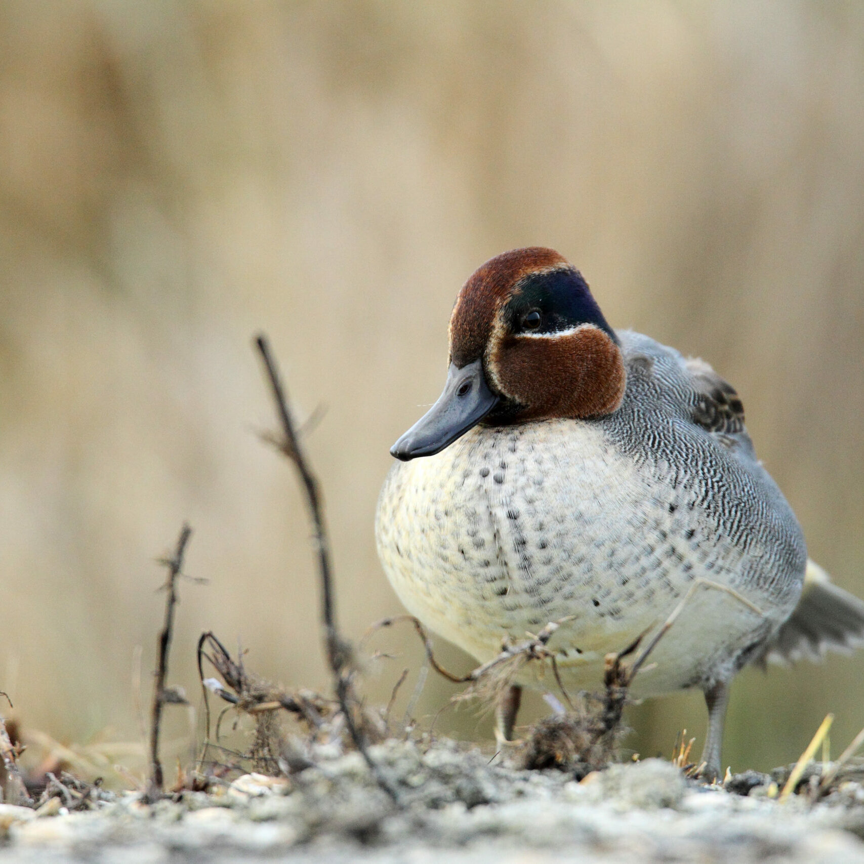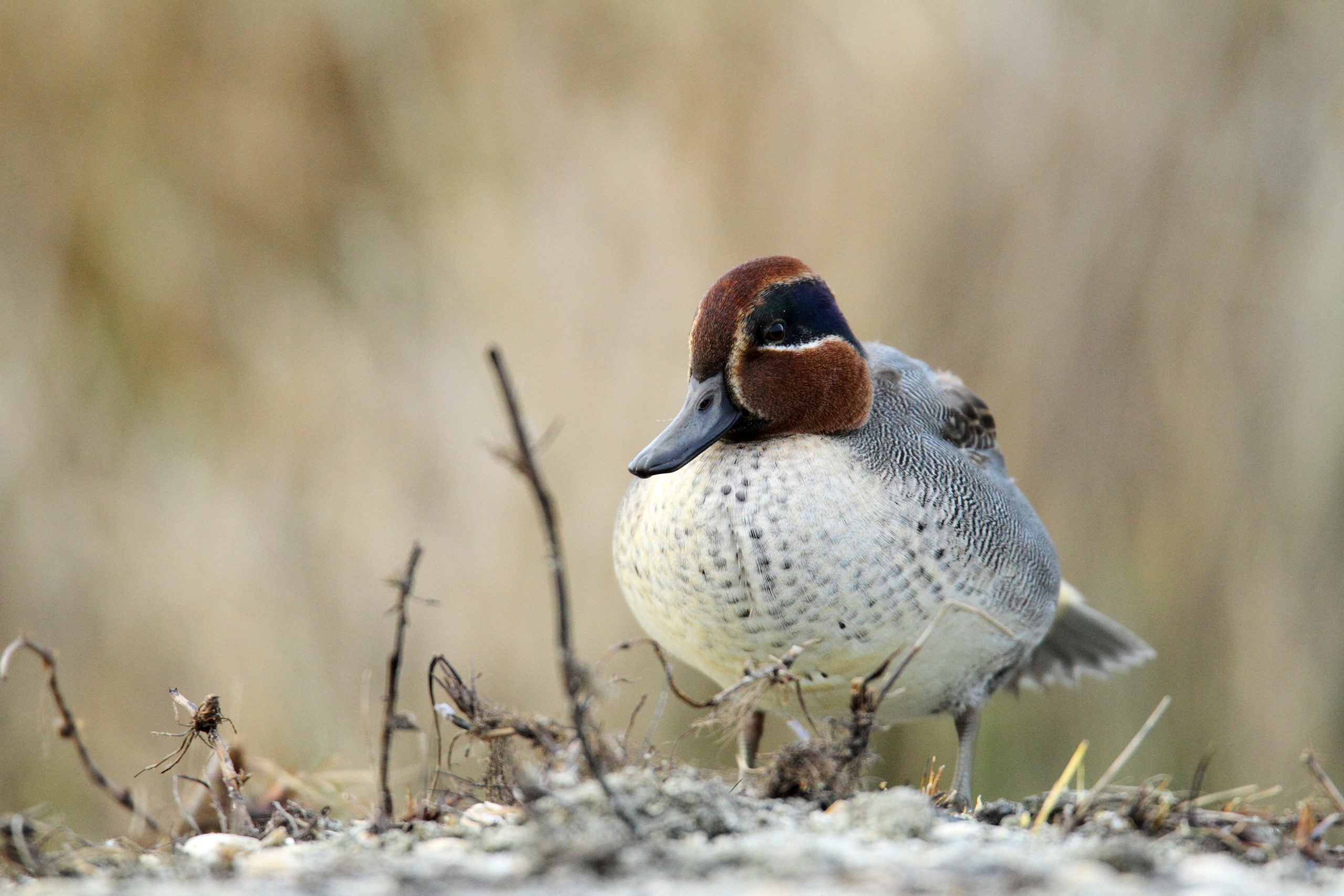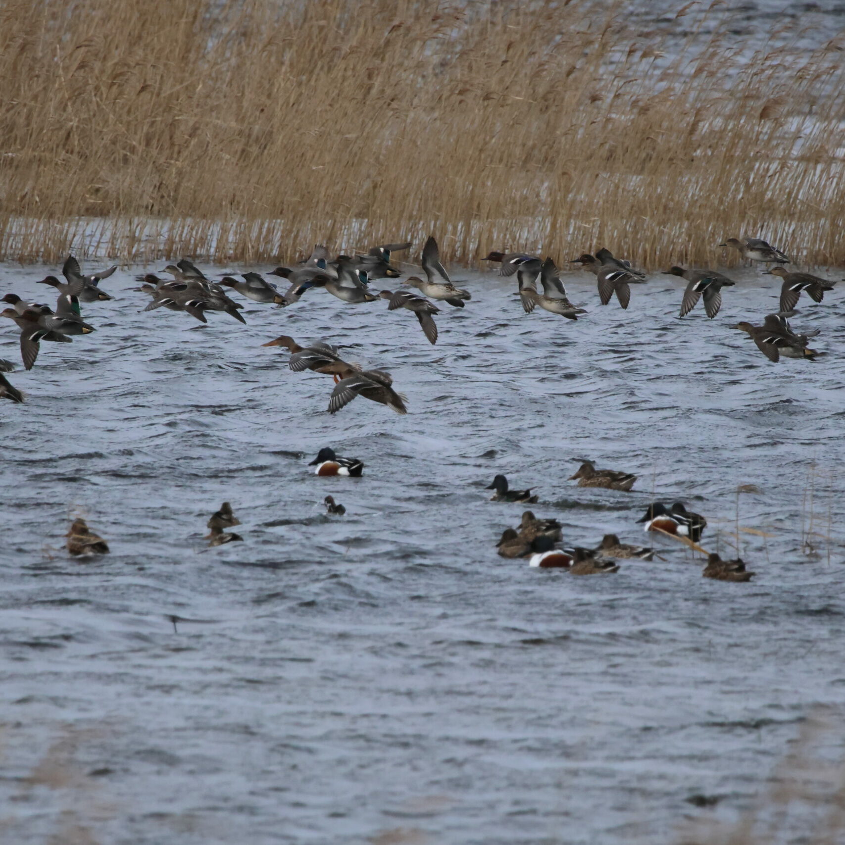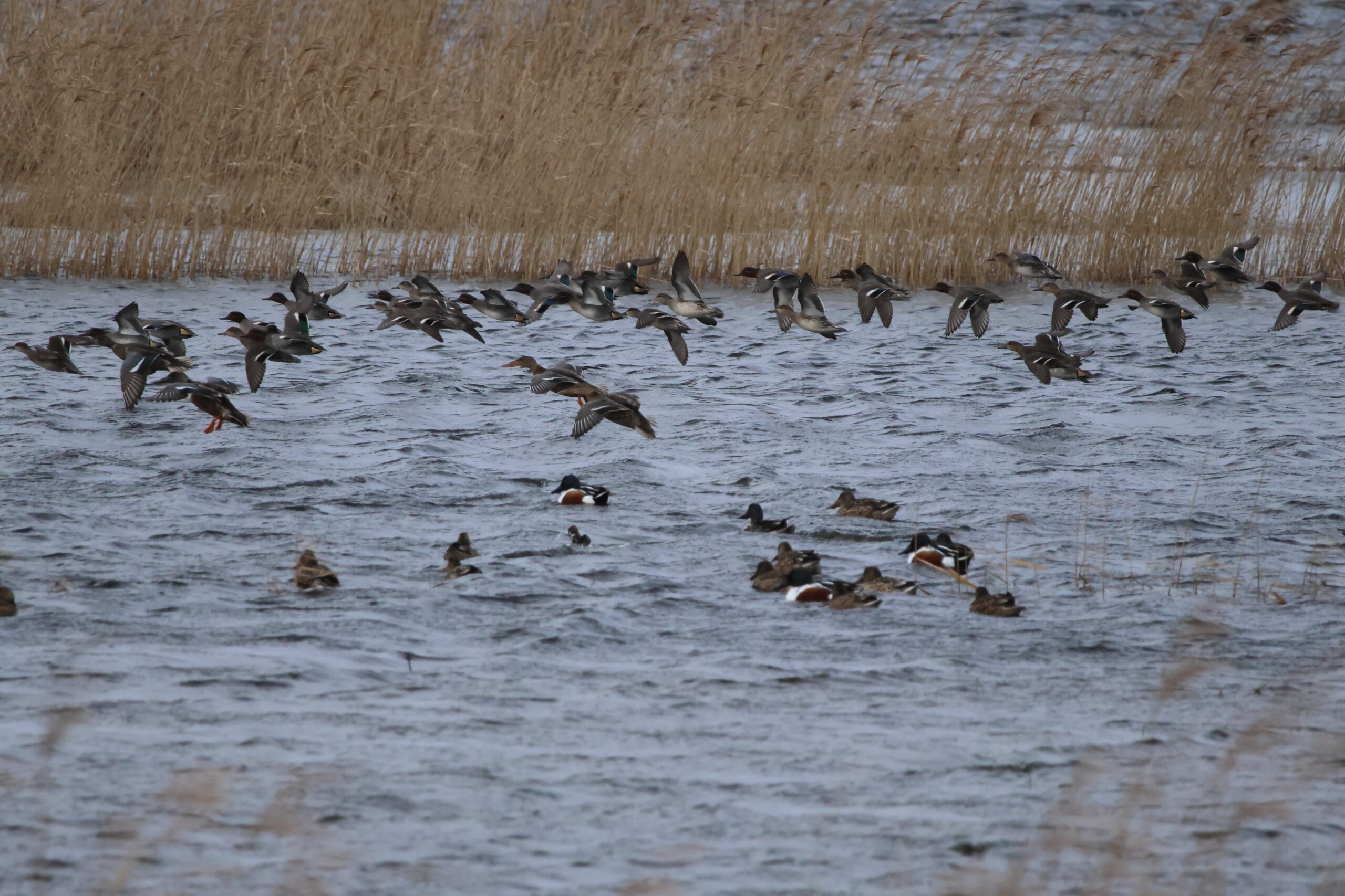 Chaque hiver, la Réserve accueille de nombreux oiseaux d’eau profitant des habitats calmes et riches en nourriture qu’offre la zone humide. Parmi les espèces les plus régulièrement observées figurent le Canard colvert, la Sarcelle d’hiver, la Foulque macroule et le Vanneau huppé qui trouvent dans les eaux peu profondes de quoi s’alimenter et se reposer. Hérons cendrés, Grandes aigrettes et Aigrettes garzettes fréquentent également le site, à l’affût de poissons ou d’amphibiens. Le Canard souchet affectionne les mares qu’il explore avec son bec si particulier accompagné au cœur de l’hiver par les Canards siffleurs. Hivernante régulière ces 20 dernières années, l’Oie cendrée ne semble plus trouver les conditions optimales à son hivernage sur la Réserve. Seuls quelques individus utilisent ponctuellement le site. Année après année, la Bécassine des marais fréquente les prairies humides et les fossés inondés, où elle sonde le sol de son long bec à la recherche de vers et de larves. Espèce discrète et parfaitement cryptique, elle se laisse rarement observer en dehors de ses vols bruyants. Quelques individus de Butoir étoilé semblent hiverner sur le site en utilisant également les roselières bordant l’étang de Lannénec, situé à quelques centaines de mètres.