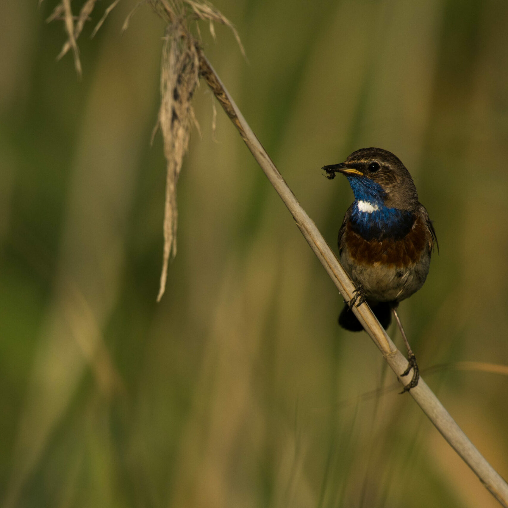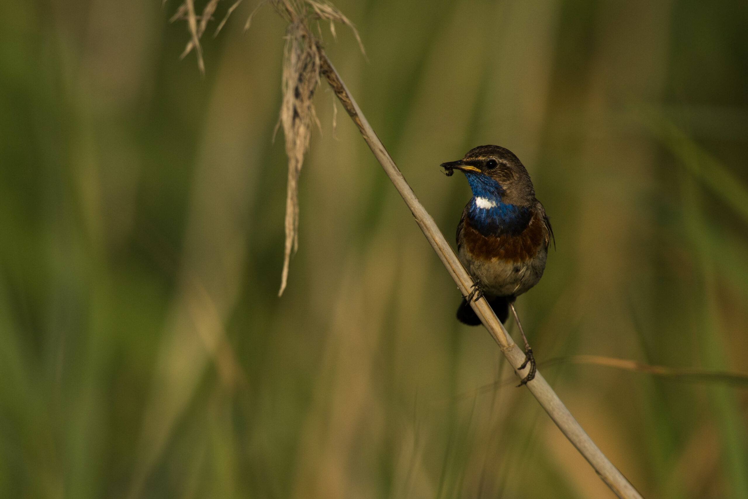 En période de reproduction, autour des prairies et des mares, les roselières constituent des habitats précieux pour de nombreuses espèces de passereaux au premier rang desquelles nous y trouvons le Phragmite des joncs et la Rousserolle effarvatte. Après avoir hivernés en Afrique tropicale et traversés le désert du Sahara, ces minuscules oiseaux regagnent leur site de reproduction à partir de la fin mars. Leur chant égaie les monotones roselières. À partir du mois de juillet et après avoir élevé un, deux ou trois jeunes, ils regagnent leurs quartiers d’hivers africains. Le Bruant des roseaux n’est pas, paradoxalement, inféodé aux roselières. Ils les utilisent au même titre que les milieux adjacents comme les fourrés et prairies. À l’inverse des premières cités, cette espèce est sédentaire et on la rencontre également l’hiver. La Gorgebleue à miroir va privilégier les roselières de tout type, y compris la cariçaie basse. Il est également possible de l’observer chanter perchée sur un fourré de prunelier. La rare Locustelle luscinoïde complète le cortège des passereaux paludicoles. Cette espèce très furtive dans les denses roselières a un chant très particulier qui permet sa détection. Une autre espèce que l’on va rencontrer, et surtout entendre, au bord des roselières est le Râle d’eau. Cette espèce craintive se laisse observer que très rarement, mais son cri qui s’apparente plus à un grognement étrange, trahit sa présence.